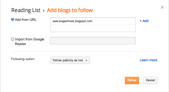 Next, type in the URL of the blog you'd like to follow in the URL box. You can add as many blogs as you'd like by clicking on +Add. When you've added all of your favorite blogs, decide whether you'd like to follow the blog publicly or privately, and then click Follow.